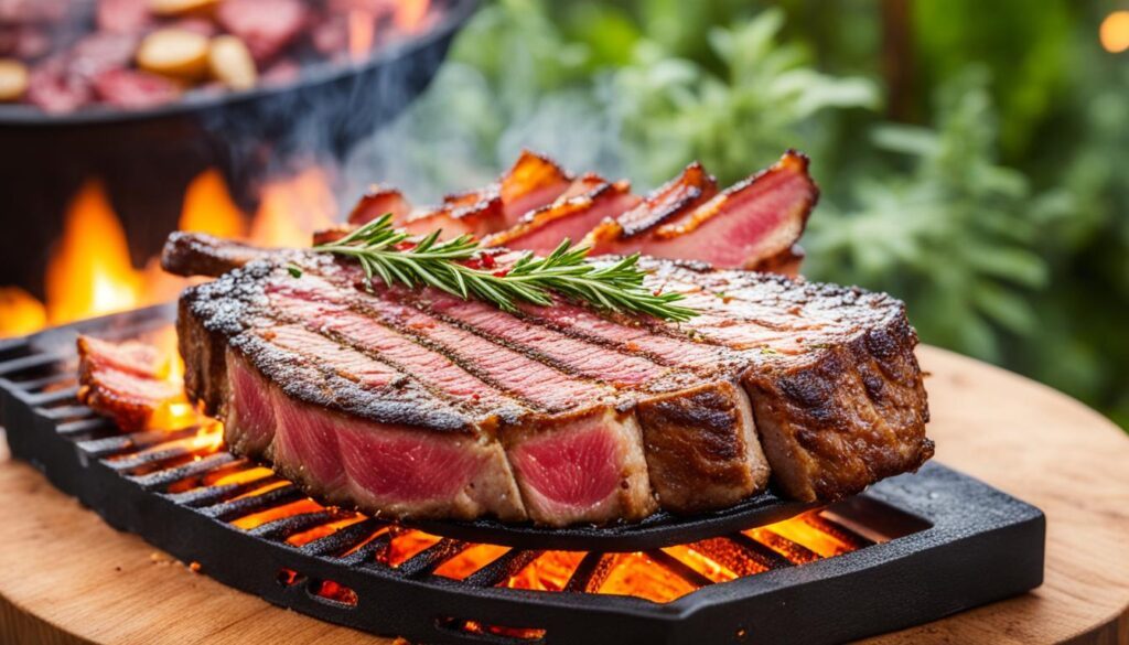 Para cozinhar a picanha na brasa, é preciso habilidade. Usar uma parrilla, temperos e marinadas certos é importante. Também é crucial controlar o ponto da carne para que fique suculenta e cheia de sabor. Serve-se com farofa crocante e outros pratos típicos.